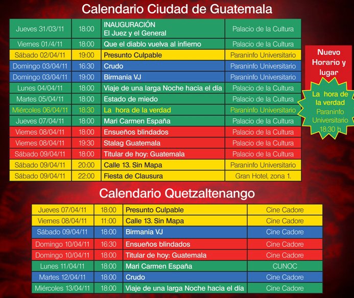 Admisión: Q.560, Q.400 y Q.300.Y eso es todo por ahora. Se seguirán agregando eventos al calendario a través de la semana así que si hay algo que quieran ver agregado, envíenos la información y se lo agregamos con mucho gusto. Regresen de nuevo a ver que más hay. Se les desea una linda semana a todas y todos.
